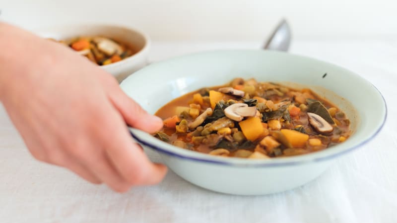 2. Incluir todas las verduras, mezclar bien y agregar el agua hirviendo. Incorporar todo muy bien y dejar cocinar semi tapado a fuego medio por aprox 15 minutos (o hasta que la papa y el zapallo estén blandos).