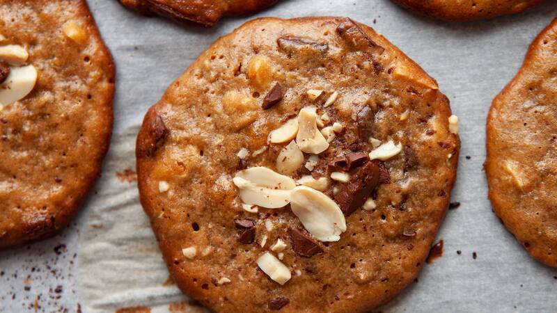 4. Poner una cucharada de la mezcla aproximadamente por galleta en una lámina antiadherente para horno, encima agregar maní picado y chips. Hornear por 10 a 15 minutos o hasta que estén firmes y doraditas. Dejar enfriar antes de comer.