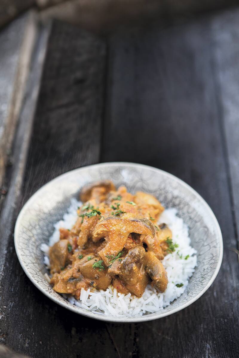 1. En un sartén calentar el aceite a fuego medio, agregar la cebolla y ajo y cocinar 2 minutos, añadir el tomate y cocinar hasta que la cebolla esté transparente, añadir la páprika, azafrán, comino, semillas de cilantro, jengibre y cocinar 1 minuto. Incorporar los champiñones, seguir cocinando 1 minuto más y agregar la pasta de tomates. Verter 30 ml de agua, bajar el fuego a bajo y cocinar 5 minutos, revolviendo de vez en cuando hasta que los champiñones estén cocidos. Luego añadir el yogurt, crema y sazonar con sal y pimienta; cocinar 2 minutos más. Retirar del fuego y espolvorear el cilantro fresco. Servir acompañado con arroz basmati.
