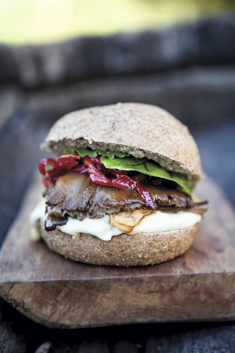 4. Sobre 4 mitades de pan esparcir la salsa roquefort, distribuir los champiñones salteados, encima mezcla de pimentones y finalizar con hojas verdes. Tapar el sánguche con el resto de las mitades de pan y servir de inmediato.