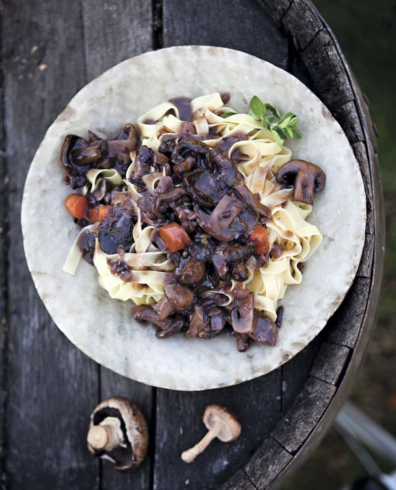 4. En un bol pequeño mezclar el harina con 1/3 taza (80 ml) de agua, verter a la olla y mezclar bien. Incorporar los hongos reservados, tapar nuevamente y cocinar 10 minutos más, revolviendo constantemente hasta que se evapore el líquido. Corregir la sazón y servir acompañado de fettuccini.