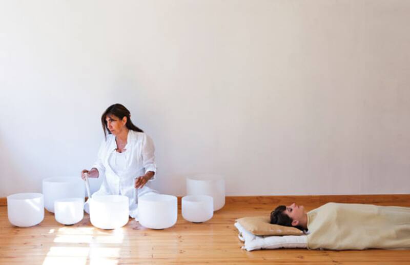 Después de la meditación matutina se hace una sesión de cuencos de cuarzo –extraído en Chile y hechos en Nepal– que la terapeuta Alicia Haeussler hace sonar con baquetas –o palos– de madera forrada en fieltro para alinear las energías y vibraciones.