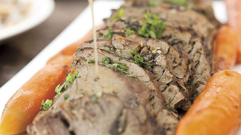 3. En un olla grande calentar el resto del aceite a fuego medio, agregar la carne y sellar por todos lados. Bajar el fuego a bajo, agregar las zanahorias y cocinar 1 1/2 horas o hasta el punto deseado. Ir agregando un poco de agua hirviendo a medida que se cocina la carne. Retirar la carne y cortar en tajadas.