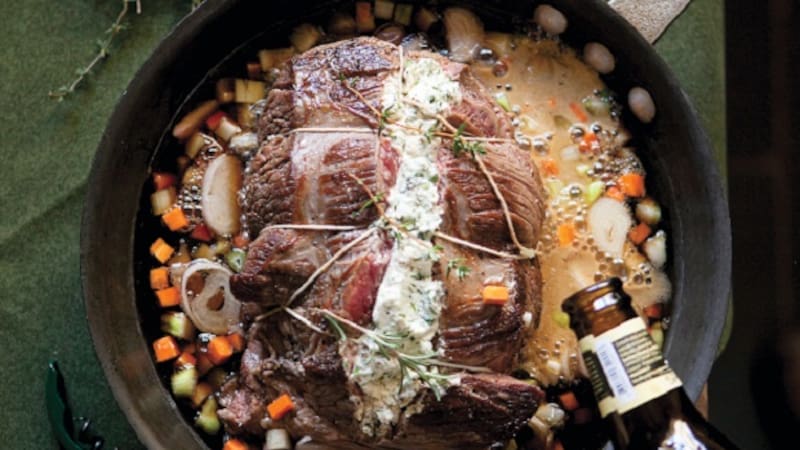 Roast beef de posta negra al horno, relleno de queso de cabra y hierbas con salsa de verduras y cerveza