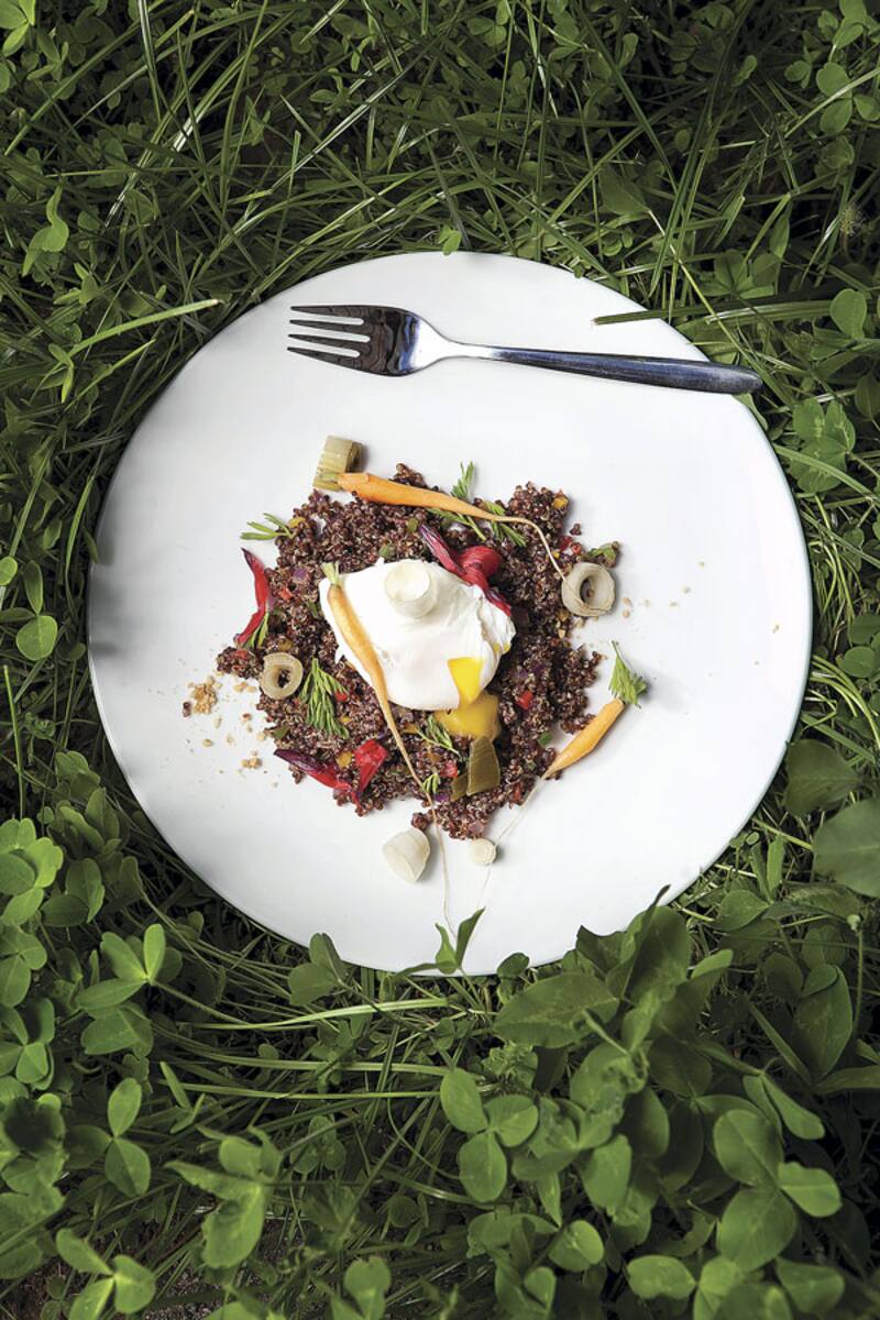 Quínoa roja con vegetales, queso de cabra y huevo pochado.[/caption]