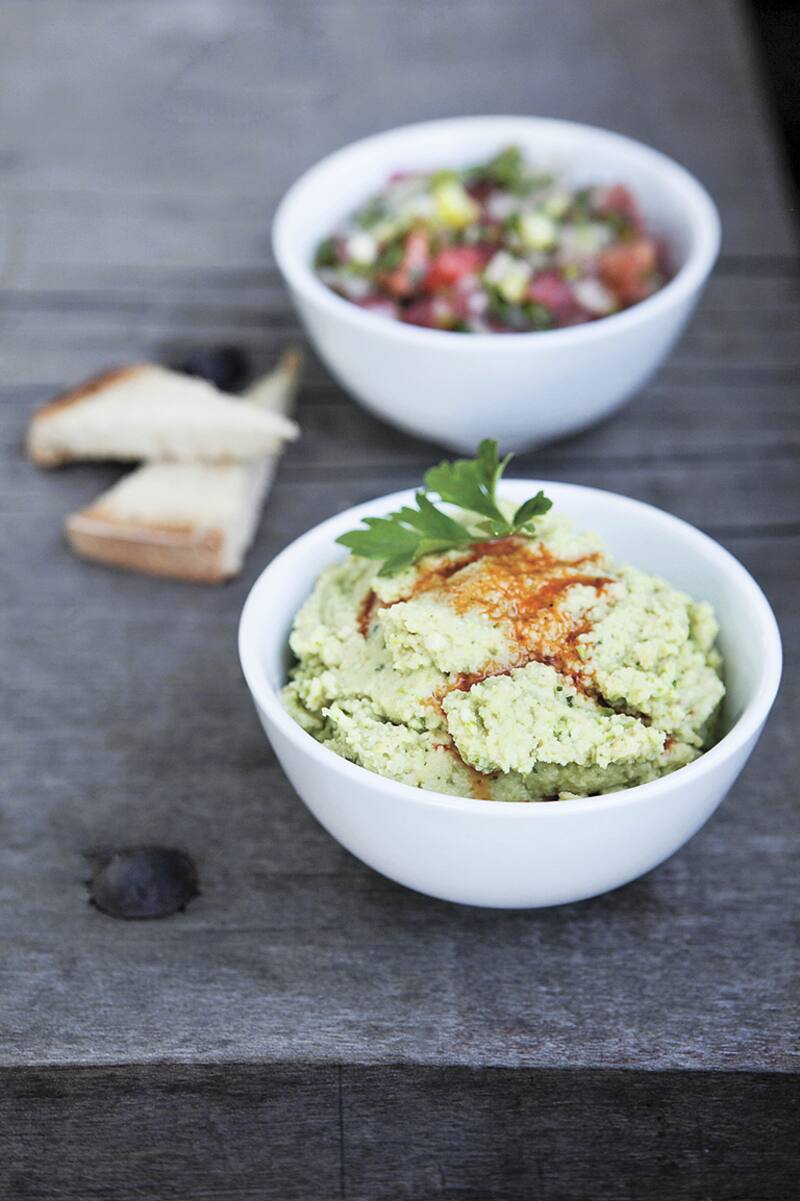 2. En una procesadora vertical o minipimer colocar las arvejas, garbanzos, perejil, ajo, jugo de limón, aceite y comino. Procesar hasta obtener un puré. Transferir a un bol y dejar enfriar a temperatura ambiente, revolviendo ocasionalmente. Sazonar con sal y pimienta. Servir acompañado de tostadas.
