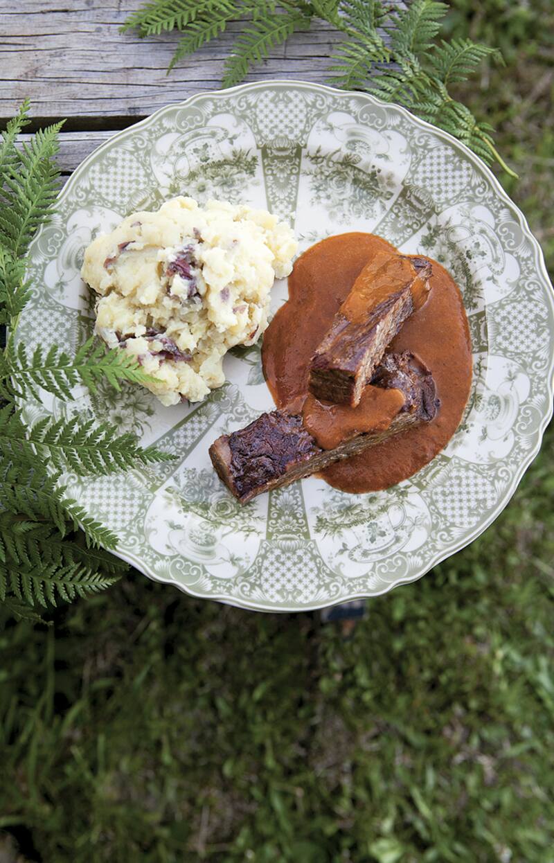 4. En platos individuales distribuir la carne con su salsa y puré rústico. Servir de inmediato.