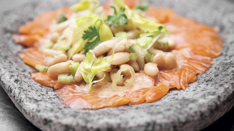 3. En un plato individual distribuir las láminas de salmón traslapadas y colocar al centro la ensalada de porotos. Servir de inmediato.