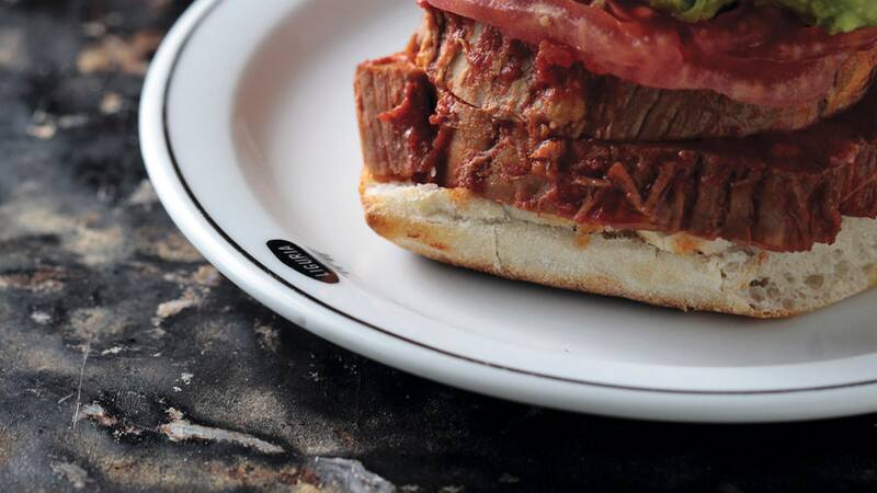4. Cuando tengas la mechada caliente, abre la marraqueta y ponla en el tostador por lado y lado. En la base del pan agrega el trozo de carne y sobre él una generosa cucharada de salsa y junto al tomate rebanado. Cierra el pan calientito.