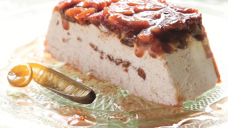 3. Antes de servir, desmoldar el semifrío, cortar en tajadas gruesas y servir en platos individuales.