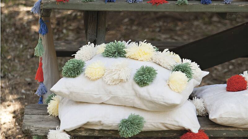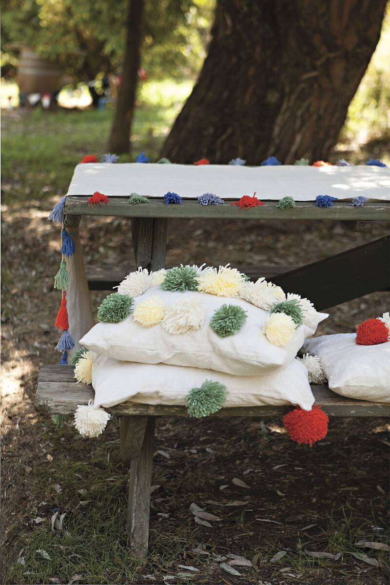 5. Coser los pompones sobre los cojines eligiendo algún diseño.