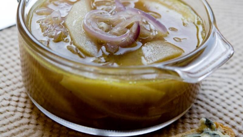 3. En pocillos individuales distribuir la sopa de cebolla morada y manzana. Servir de inmediato acompañada de las tostadas de roquefort reservadas. ·
