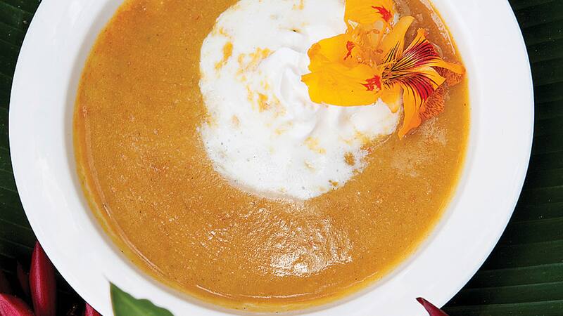 En un sartén calentar el aceite a fuego medio, agregar el pimentón y cocinar hasta que esté al dente. Incorporar los plátanos y seguir cocinando hasta integrar. Agregar el curry, caldo y sazonar con sal y pimienta. Transferir a la licuadora y licuar hasta que la mezcla esté homogénea y con una textura muy delicada.