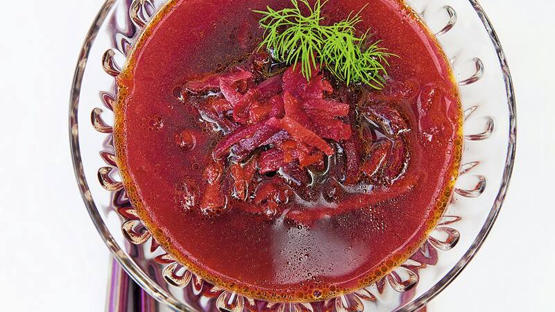 Esta receta está inspirada en la clásica sopa Borscht, pero se presenta en una versión rápida y sencilla. Se sirve caliente o helada acompañada de la tradicional crema ácida condimentada con el rábano picante, que da como resultado una sorprendente combinación.