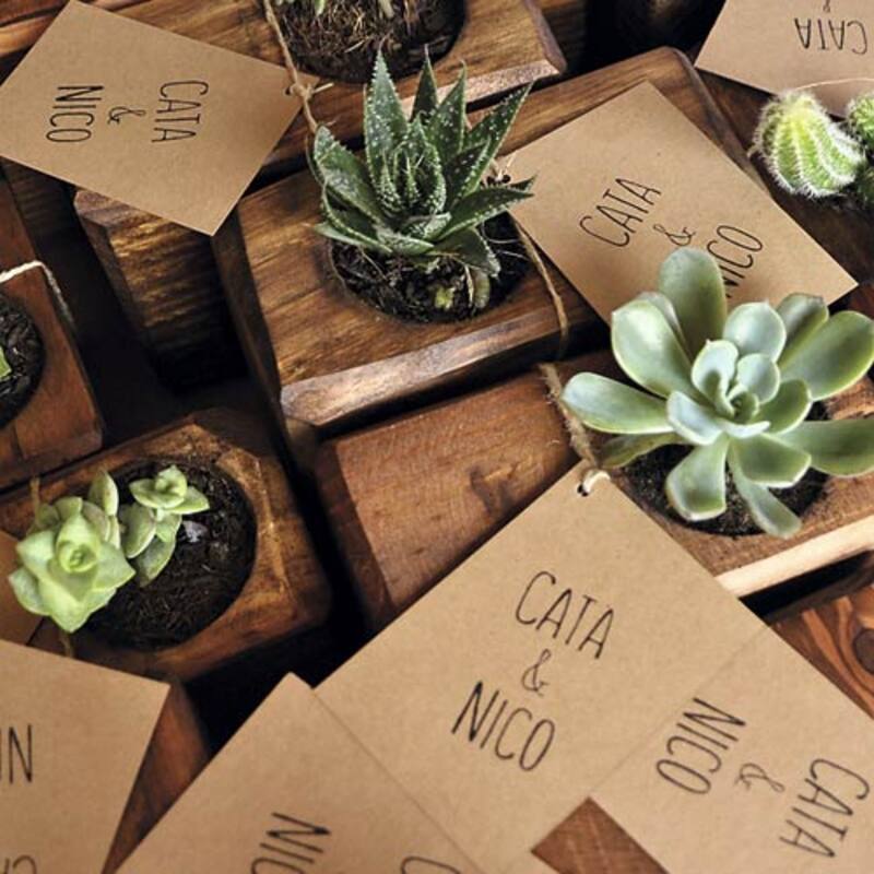 La empresa Roots, que se dedica a fabricar muebles y objetos de decoración con maderas recicladas, usa retazos de madera y tronco para hacer macetas con suculentas –especies agave y echeveria–. Se pueden encargar al por mayor y son una excelente alternativa de "regalos-recuerdo" para matrimonios. Se piden con 45 días de anticipación y se puede incluir una tarjeta con los nombres de los novios. También hacen arreglos de suculentas sobre troncos de árbol caído que han recolectado en distintos viajes a lo largo de Chile, principalmente en río Puelo y otros sectores campestres. Cada trabajo es exclusivo y único. Pedidos a roots.recicla@gmail.com.