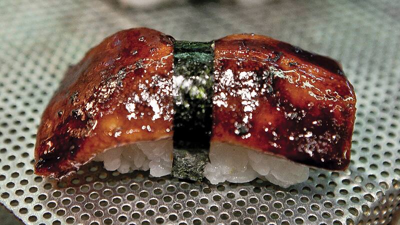 6. Hacer moldes de arroz con las manos y pincelar con la mezcla de curry. Disponer encima del arroz una tira de papada o mejilla para cubrir el arroz. Servir decorados con las tiras de nori.