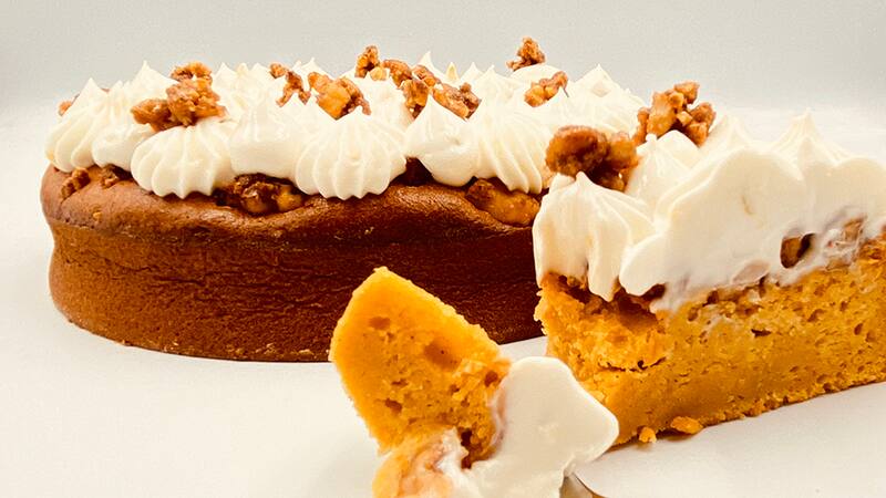 Tarta de zapallo asado, nueces caramelizadas y crema de queso de cabra con limón