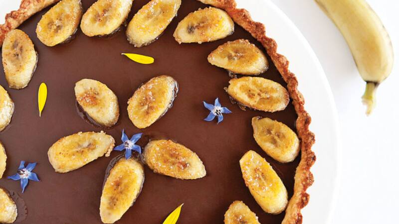 3. Antes de servir, pelar los plátanos y cortar diagonalmente en tajadas. En un sartén grande antiadherente calentar el resto de mantequilla a fuego medio, espolvorear el azúcar y cocinar hasta formar un caramelo. Colocar las tajadas de plátano y cocinar hasta dorar por ambos lados. Dejar enfriar y distribuirlas en forma decorativa sobre el chocolate. Decorar con flores comestibles.