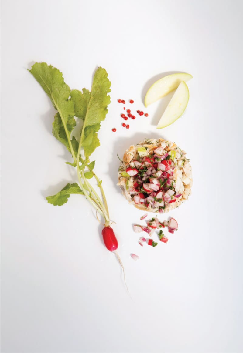 3. En platos o vasos pequeños individuales distribuir el tártaro y encima el picadillo de rabanitos.