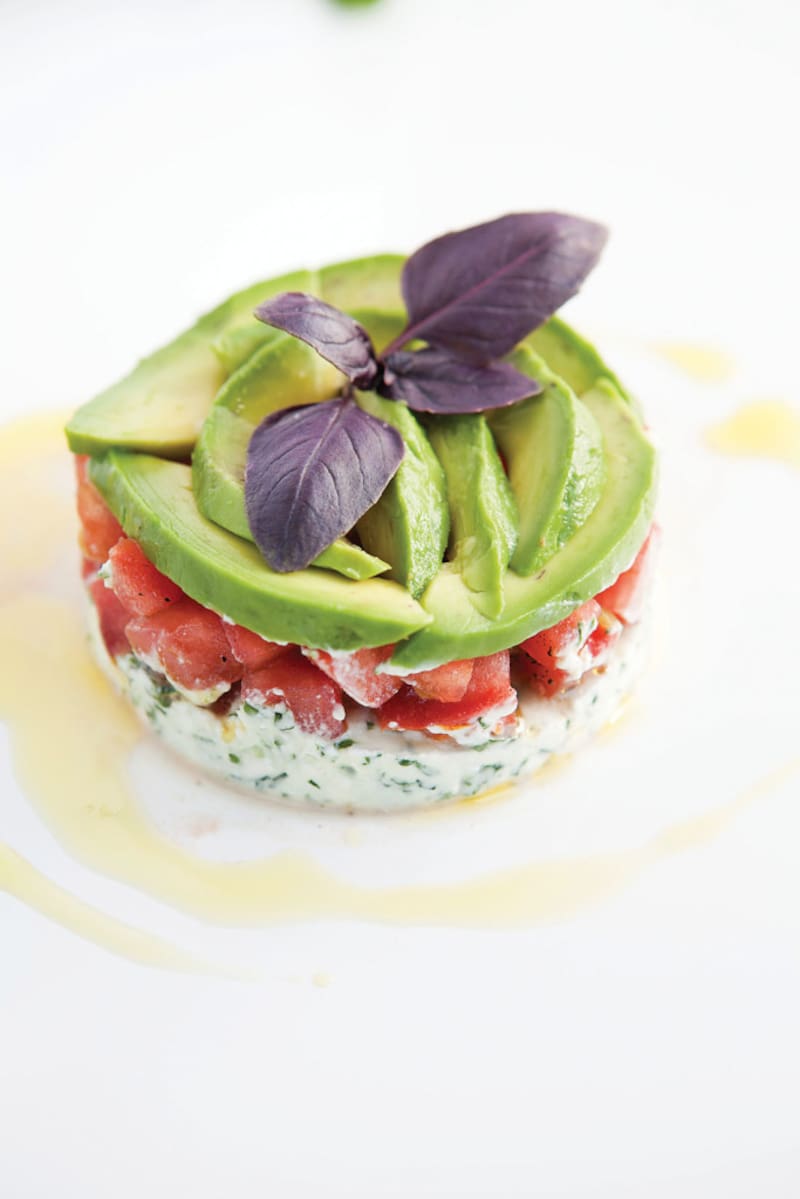 5. En platos individuales colocar al centro moldes de timbal y rellenar cada molde con la ricota con hierbas, luego el tártaro, presionar y encima las láminas de palta. Decorar con hojas de albahaca.