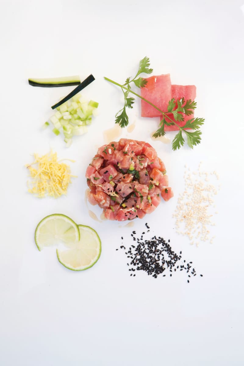 Tártaro de atún al estilo asiático con pickles de pepino.[/caption]