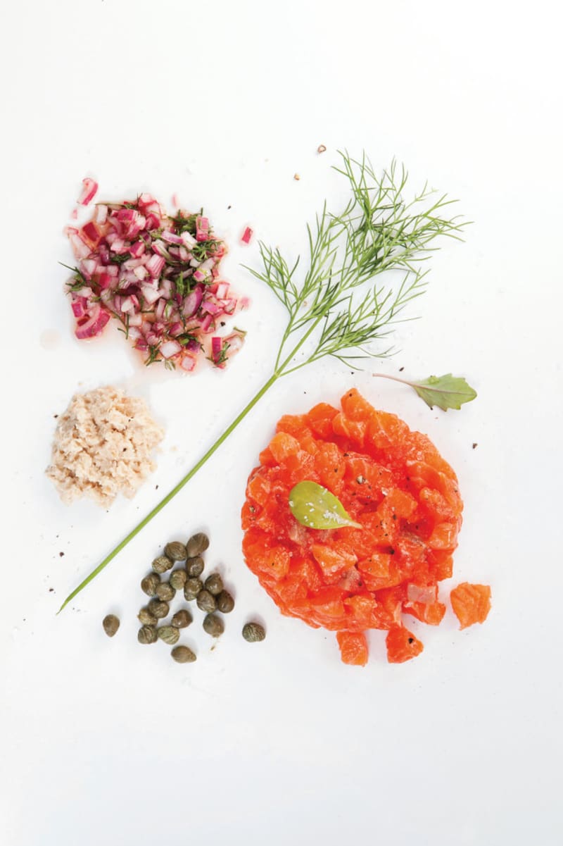 Tártaro de salmón con rábano picante, alcaparras, cebolla morada y eneldo.[/caption]
