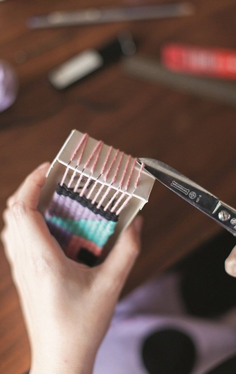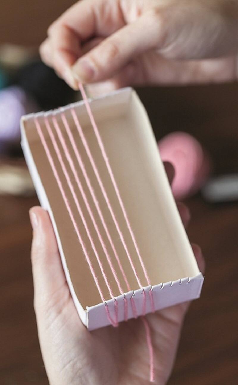 3. Montar la urdimbre. Elegir un color y pasar el algodón de forma vertical incrustando las fibras desde la primera ranura hasta la última pasando por debajo de la caja. Debe quedar tenso. Al terminar, anudar el inicio del algodón con el final.