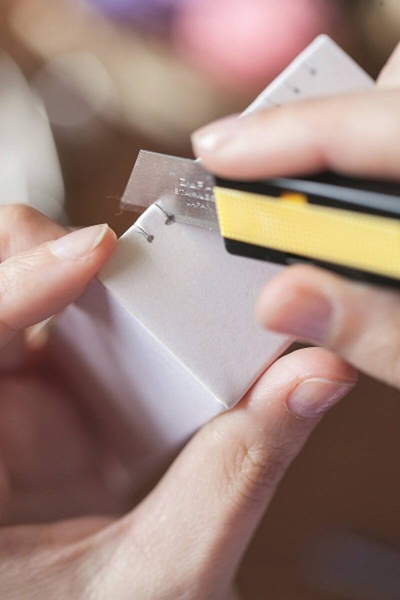 2. Con el cuchillo cartonero hacer una pequeña ranura desde el borde de la caja hacia abajo. Repetir en ambos costados.