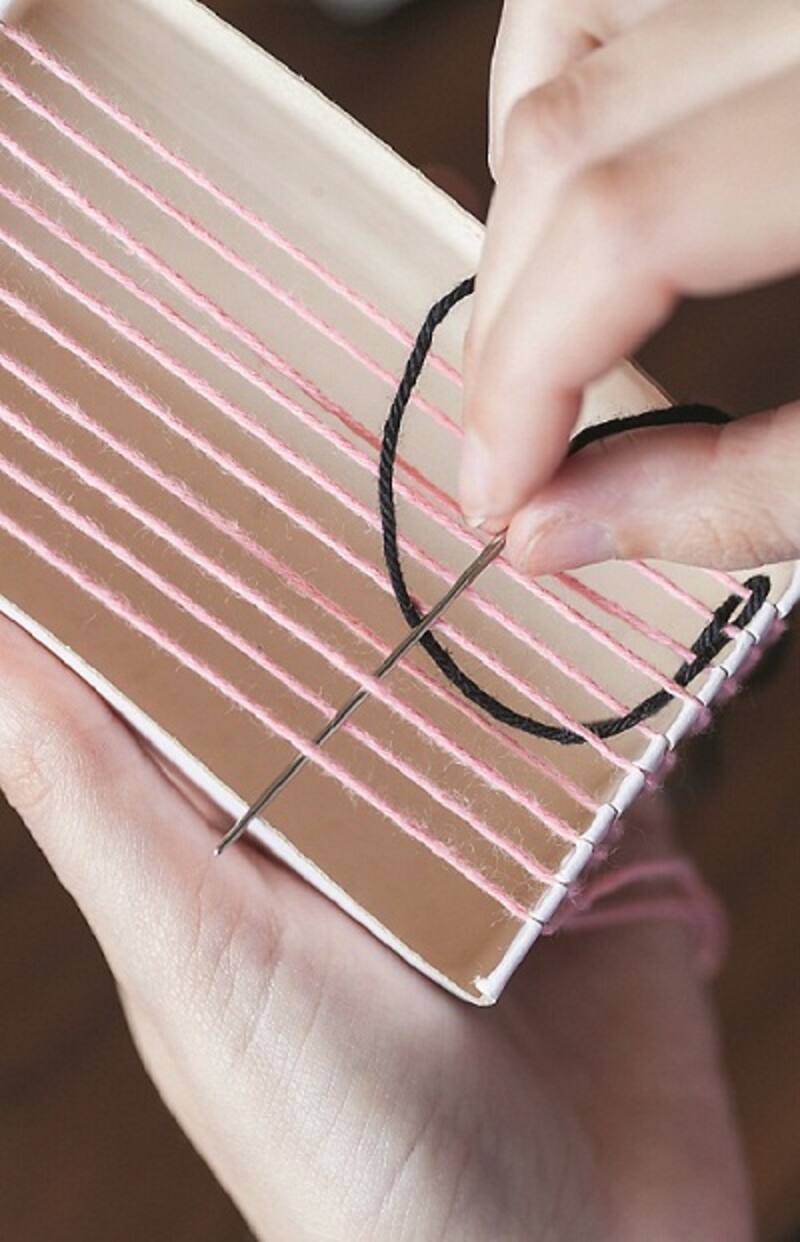 4. Comenzar a tejer. Elegir un color de algodón y enhebrar la aguja. Pasarla intercalando la urdimbre por arriba y por debajo. Al finalizar la pasada, acomodar el algodón a la parte inferior de la caja. Devolverse por el lado contrario.