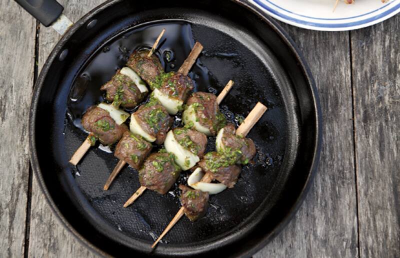 En un bol colocar 200 ml de aceite de oliva, 2 cucharaditas de vinagre de vino blanco, 2 cucharadas de cilantro picado fino, 2 cucharadas de perejil picado fino, 2 cucharadas de ciboulette picada y 4 cucharadas de mermelada de ruibarbo, mezclar hasta integrar y sazonar con sal y pimienta. Agregar la carne al bol, tapar con papel plástico y dejar marinar en el refrigerador 3 horas. En palos de bambú o de lengas previamente humedecidos, armar las brochetas insertando alternadamente carne y trozos de cebolla. Reservar la marinada. En una parrilla encendida a fuego medio colocar las brochetas y asar 8-10 minutos por cada lado, dando vueltas ocasionalmente y pincelando con la marinada reservada. Retirar de la parrilla y servir de inmediato.