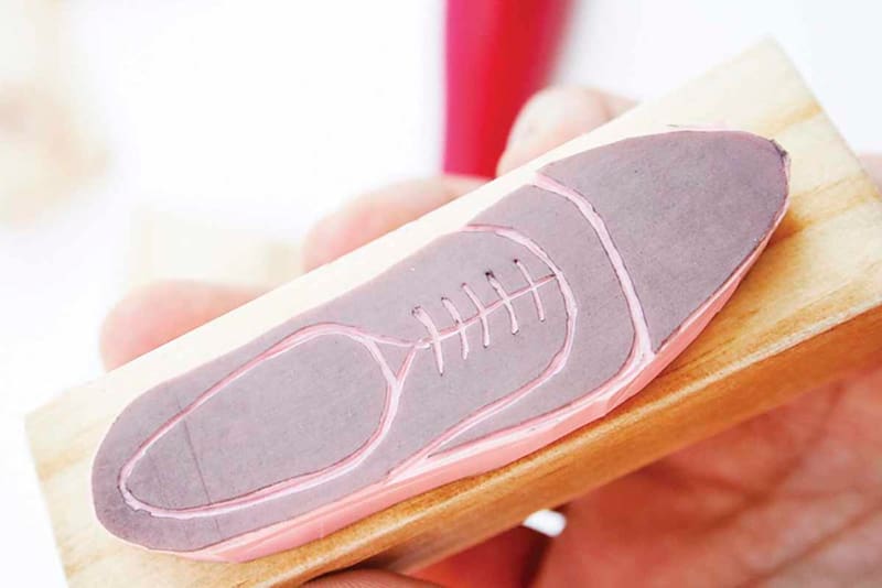 Comenzar a tallar el dibujo recordando que la parte que se quite del linóleo no tendrá tinta. Limpiar el linóleo sobrante con un pincel.
