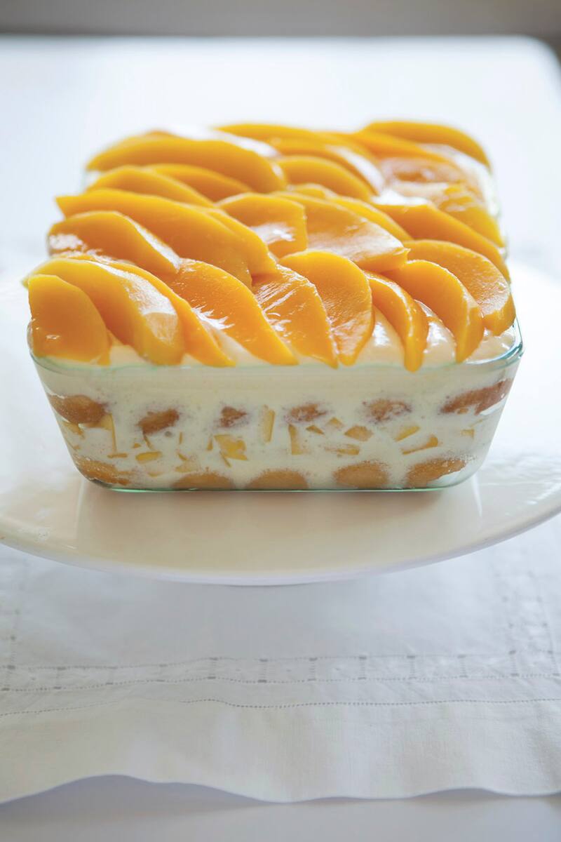 3. En un recipiente colocar el jugo de mango, pasar las galletas de a una y colocarlas en una budinera grande hasta formar una capa. Cubrir con la mitad de la mezcla de queso crema, encima distribuir el mango en cubos formando otra capa y repetir el mismo procedimiento con el resto de las galletas y crema. Finalmente decorar con las láminas de mango y refrigerar, mínimo 20 minutos.