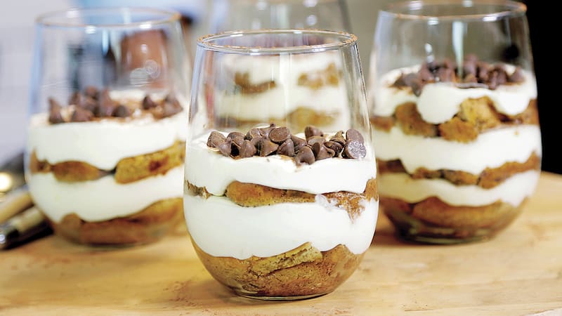 3. En vasos individuales distribuir los trozos de galletas remojadas y mezcla de queso crema reservada en forma intercalada. Espolvorear con los chips de chocolate y servir de inmediato.