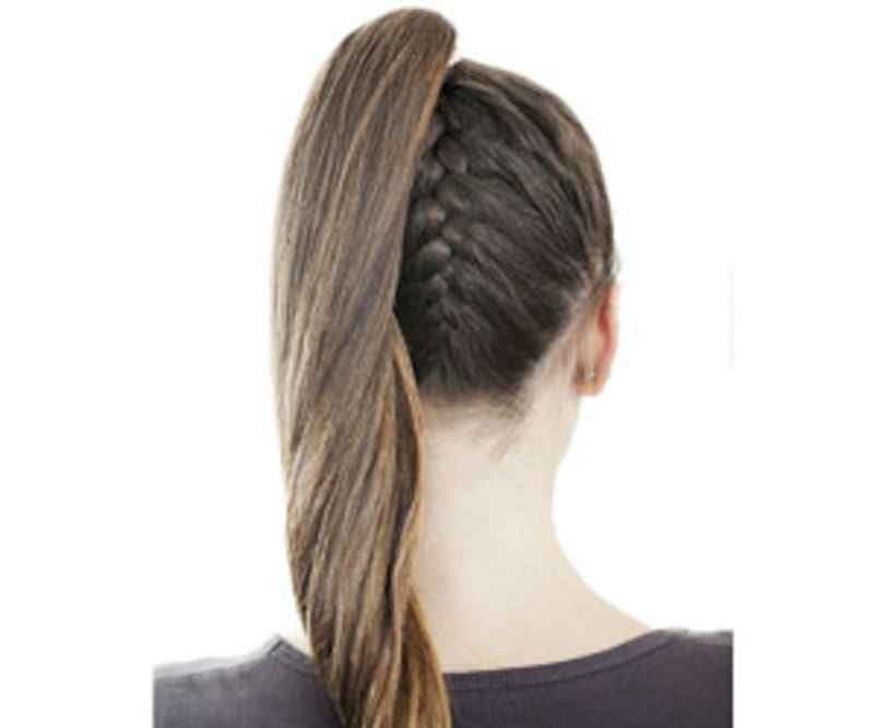 2. Con un elástico amarrar la trenza junto con el resto del pelo en una cola de caballo que quede en la parte más alta de la cabeza.
