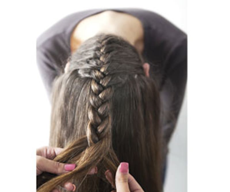 1. Con la cabeza hacia abajo, peinar todo el pelo hacia delante. Hacer una trenza maría desde la nuca hasta la mitad del largo del pelo.