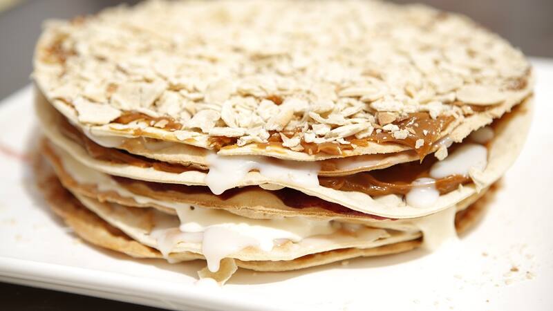 4- Luego, rellenar con manjar cada lámina de masa intercalando cada relleno con la crema pastelera, mermelada de frambuesa y la crema batida. Idealmente hacerlo dentro de un molde. Al colocar una hojarasca, presionar cuidadosamente para lograr que quede bien pegada. Una vez finalizadas todas las capas, refrigerar unos minutos. Cubrir la torta completamente con crema batida y decorar con frambuesas. Servir cada trozo de 1 dedo de ancho por porción.
