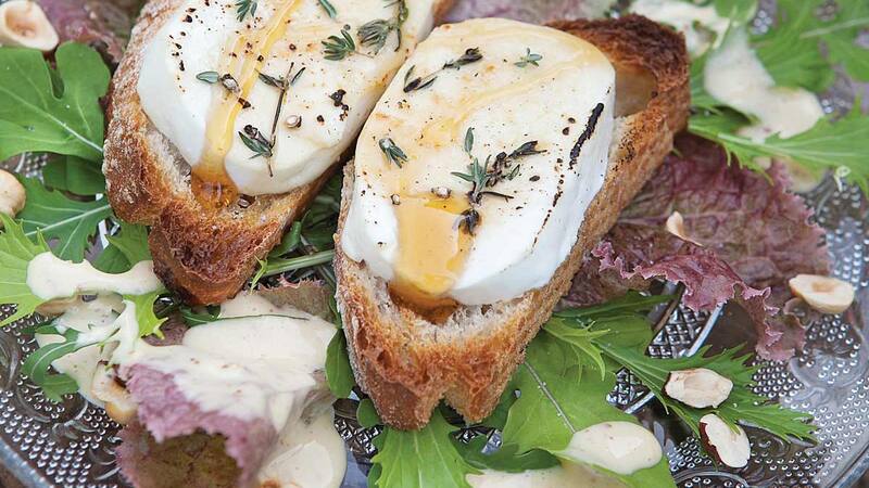 Tostadas de queso de cabra con miel y tomillo con ensalada de hojas y vinagreta de miel