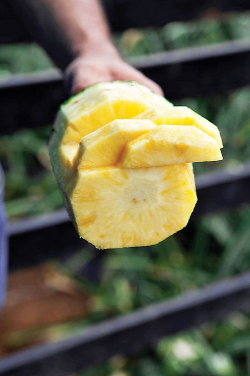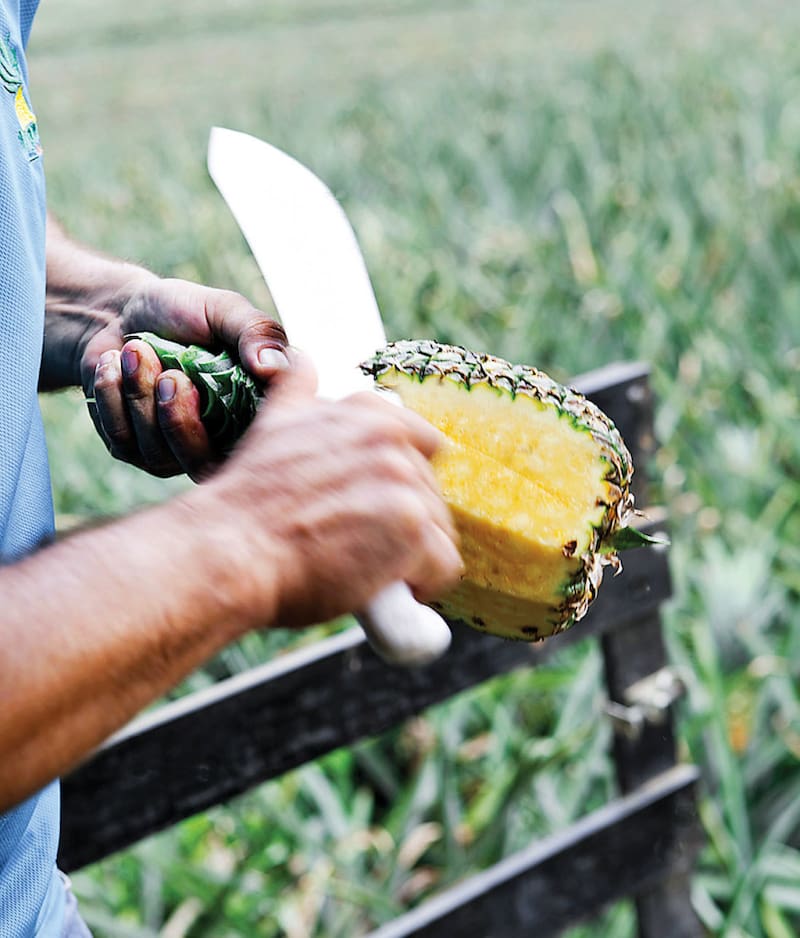 El guía baja del tractor y trae varias piñas: grandes, bonitas. "¿Saben cómo elegir una buena piña?", pregunta. Y lanza sus tips: "Hay que elegir las de ojos grandes, forma simétrica, corona verde y parte de abajo amarilla". Y en tres movimientos de machete corta la cáscara y ofrece trozos de piña fresca, amarilla y jugosa. "¿Qué tal sabe?", interroga con una sonrisa ganadora. La respuesta es unánime: es una piña dulcísima, casi como un almíbar.