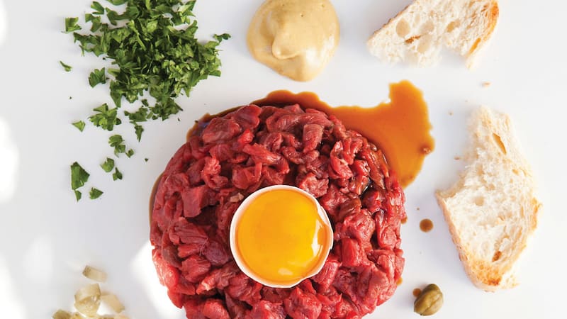 2. En platos individuales distribuir al centro el tártaro (se puede utilizar un anillo para timbal), alrededor de este la cebolla, pepinillo y perejil. Colocar cuidadosamente encima de la carne la yema en su cáscara. Servir de inmediato con las tostadas de pan.