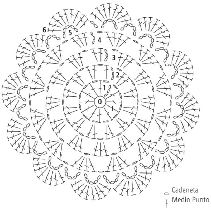 Con este diagrama puedes realizar varios diseños distintos: puedes cambiar de color en la cuarta corrida o agregar una séptima corrida aumentando 2 puntos en cada medio punto.
