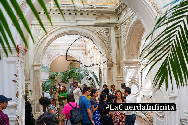 Visitar el restaurado Palacio Pereira es un panorama en sí mismo, y hacerlo ahora que está la recién inaugurada instalación La Cuerda Infinita, es una excelente idea. Se trata de un proyecto colectivo, liderado por la artista Catalina Bauer, en el que han participado más de 100 personas entre artesanos, artistas y aficionados. “Tenía ganas de trabajar en un modelo de exposición donde los trabajos no solo convivieran en el espacio, sino que se tocaran. Ahí se me vino a la mente un ejercicio de experimentación textil”, cuenta la artista. Así, comenzó a convocar a colegas a fabricar un segmento de cuerda con lo que tuvieran a mano, utilizando materiales de sus trabajos para que quedaran impregnados de cada hacer particular. Esto dio como resultado una obra en la que conviven distintas disciplinas como cerámica, pintura, fotografía y arte textil, y donde se pueden encontrar elementos tan diversos como plantas secas, conchas de mar, género, cuadros, juguetes, e incluso una trenza de pelo.