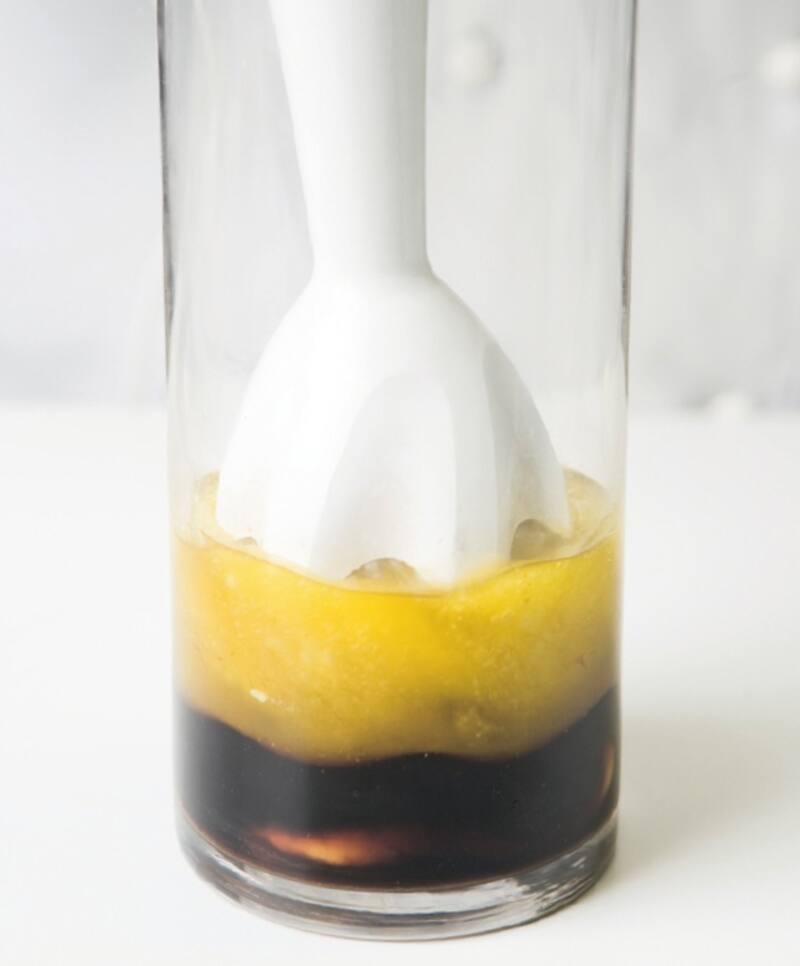 1. En el recipiente de la minipimer colocar 3 cucharadas de vinagre balsámico, ¼ cucharadita de sal, ½ cucharadita de mostaza preparada al estilo Dijón y ¾ taza de aceite de oliva.