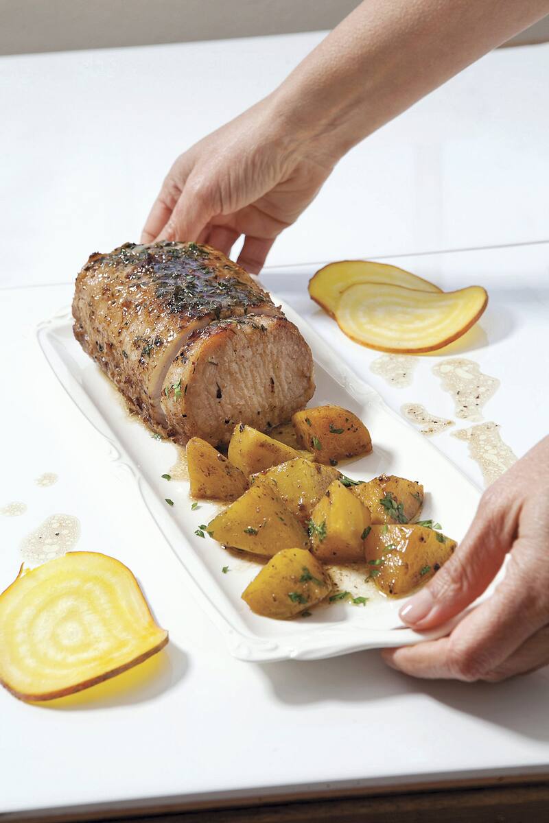 4. En una fuente extendida colocar el lomo de cerdo y acompañar con los nabos o betarragas acarameladas. Servir espolvoreado con perejil.