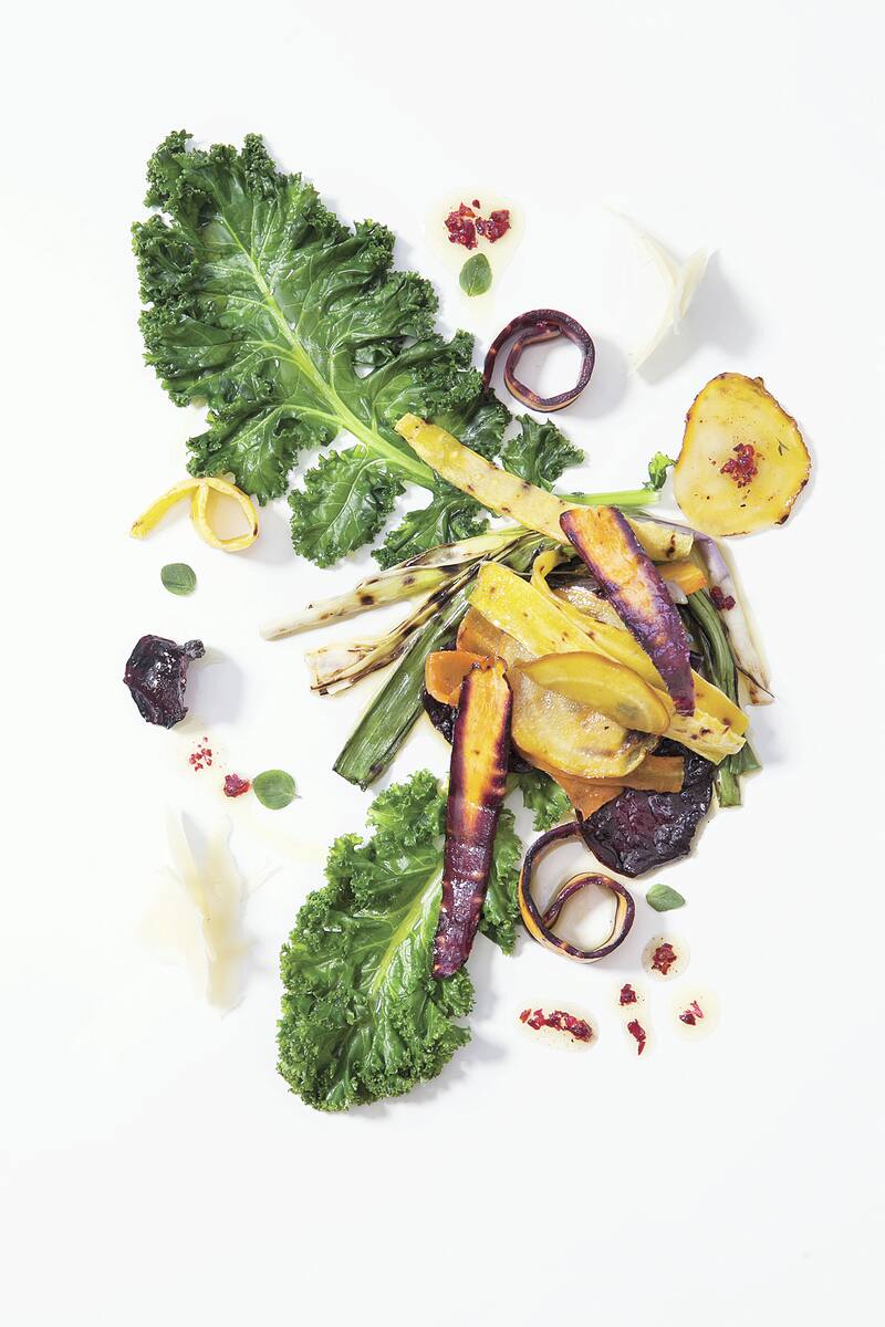 1. Con una mandolina cortar los tubérculos en tajadas finas. Calentar una parrilla eléctrica con grill a temperatura alta. Con una brocha pincelar las verduras con aceite y grillar 2 minutos por lado, hasta que aparezcan marcas del grillado. Reservar.