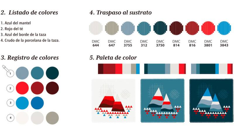 4. Traspasar a un sustrato. Buscar similitudes en una carta de colores del material, sean hilos de bordar (como en este ejemplo) o cualquier otro (lanas, pinturas, mosaicos, etc).