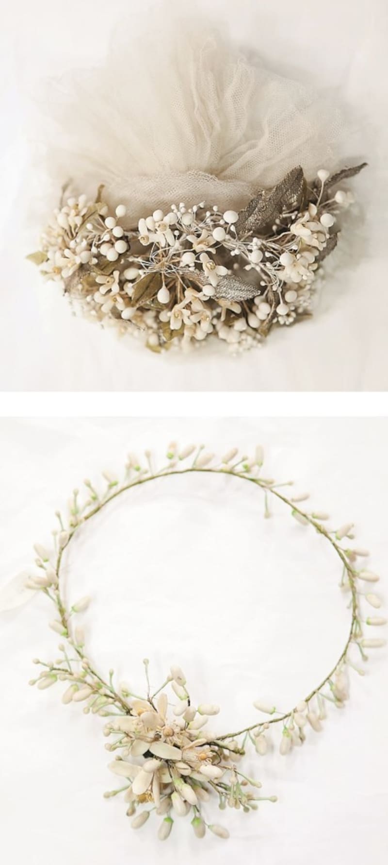 La flor que se asociaba a las novias era el azahar: la flor del naranjo, limonero o cidro, que se usaba en la cabeza, en coronas o guirnaldas, o adornando el vestido. Para los matrimonio se hacían con cera y tela, un trabajo muy delicado que iba uniendo flores y hojas en torno a un alambre forrado en género. Las novias de negro también emplearon este adorno que contrastaba con el color oscuro del vestido y las hacía más notorias; junto al velo, estas flores eran un pequeño guiño del estado de celebración de la mujer. En el caso de las novias que se casaban en segundas nupcias, no podían usar el azahar, porque es un símbolo de pureza, pero utilizaban otras flores. Las de la fotografía corresponden a accesorios de flores de azahar que usaron las novias de la época y que se conservan en el Departamento Textil del Museo Histórico Nacional.