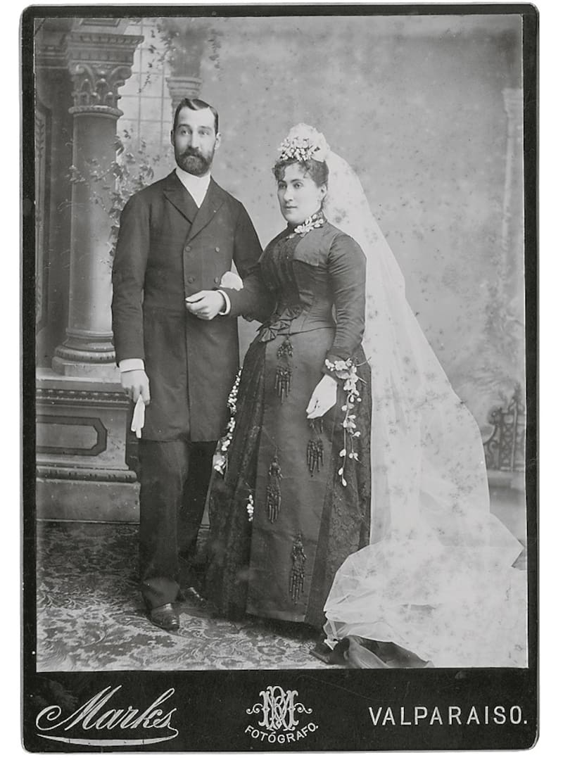 Sra Magdalena B. y su esposo Sr. Fuhrmann el día de su matrimonio en el año 1885, fotografiados en Valparaíso (archivo del Museo Histórico Nacional).[/caption]