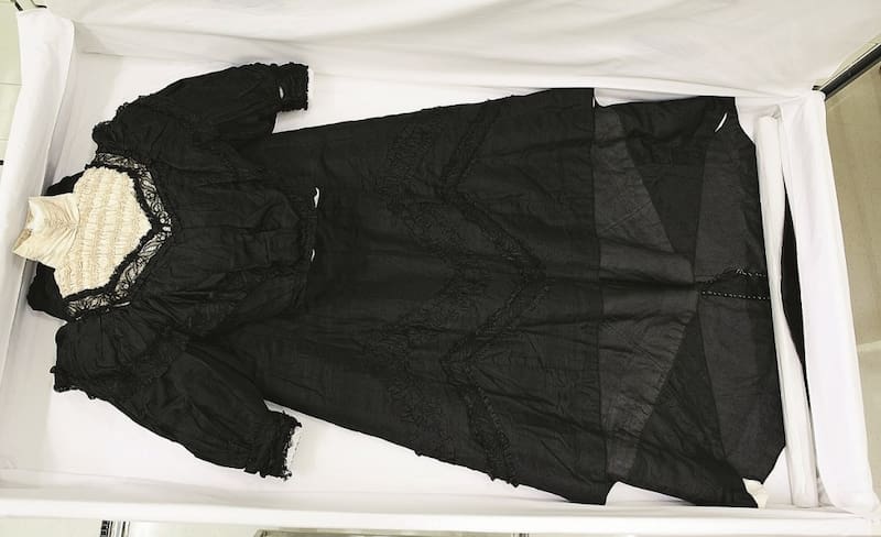 Está en el Museo de la Moda y fue usado alrededor de 1906 por Isolina Pitto Luppa para su matrimonio. Lo donó en 2001 Verónica Fajardo, cuyo marido es sobrino de Isolina. Es de raso de seda negro y tiene el cuerpo separado de la falda, que tiene detalles de encaje y cinta de seda negra, igual que las mangas, que son anchas hasta al codo. Al llegar se restauró reemplazando las cintas dañadas con otras nuevas, previamente teñidas, y luego se llevó a cabo un proceso alternativo al planchado para estirar las arrugas sin degradar la tela. Se exhibió el 2007 en la exposición Vistiendo el Tiempo y hoy se encuentra en las bodegas del museo a una temperatura de 20 grados y 50% de humedad, aproximadamente, para no deteriorar las fibras.