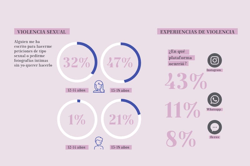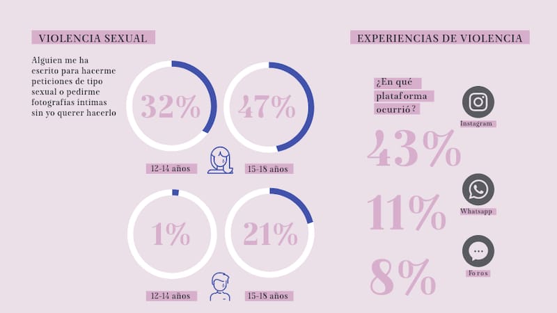 Si de violencia sexual se trata, el 35% de las niñas entre 12 y 14 años denunciaron haber recibido fotografías de genitales sin haberlas solicitado y un 32% señaló haber recibido peticiones escritas de tipo sexual o fotografías íntimas sin que ellas las hubiesen pedido. Ambas cifras aumentaron en el caso de las adolescentes entre 15 y 18 años, llegando al 51% y 47%, respectivamente.