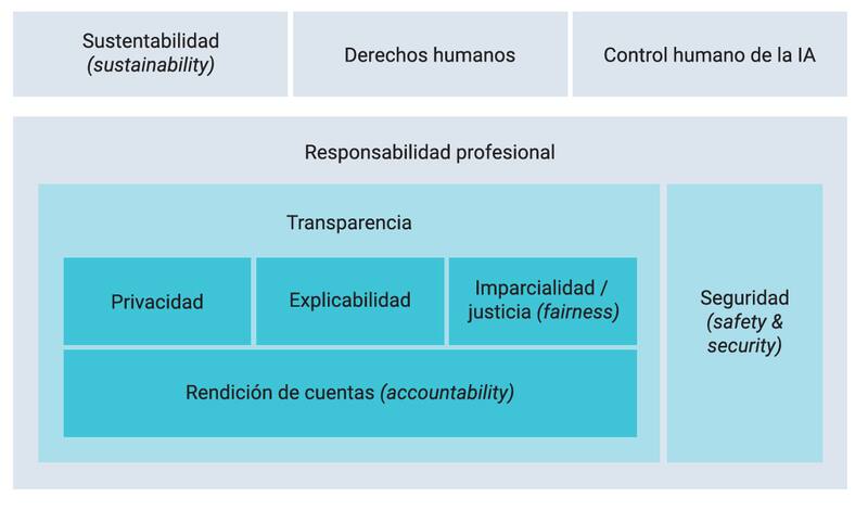 Sostenibilidad, derechos humanos y el control humano son tres niveles que puede permear, y que se sostienen sobre la responsabilidad profesional. Esta última se divide en Seguridad y Transparencia. Y esta, a su vez, incluye la Privacidad de los datos, la Explicabilidad y la Imparcialidad (”fairness”), además de la Rendición de Cuentas.